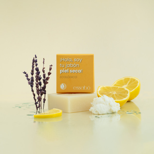 El Jabón Piel Seca de Essabó está elaborado artesanalmente mediante saponificación en frío, con base de aceite de coco y aceite de oliva bio. Enriquecido con manteca de karité y zetemol, limpia suavemente sin resecar, nutre en profundidad y devuelve la suavidad a la piel seca. Aromatizado con aceites esenciales de lavanda y limón, es ideal para una higiene natural, calmante y sensorial.