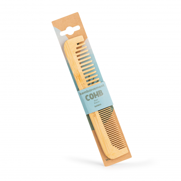 Peine de bambú natural Bamboovement, sin plástico y biodegradable. Con doble tipo de púas, finas y anchas, desenreda y peina con suavidad, reduce la rotura y la electricidad estática. Ligero, resistente y vegano, ideal para una rutina de cuidado capilar ecológica y consciente.