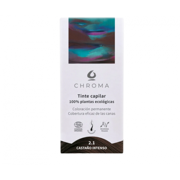 Tinte capilar vegetal Chroma 2.1 Castaño Intenso, elaborado con 100% plantas ecológicas y de Comercio Justo. Certificado COSMOS ORGANIC, vegano y testado dermatológicamente. Aporta un tono castaño oscuro con reflejos frescos y cenizas, cobertura permanente de canas y resultados avalados por laboratorio independiente.