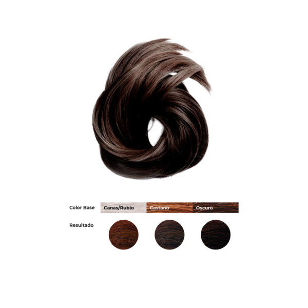 Este tono es rico en hojas de Índigo y Eucalipto, que aportan al cabello reflejos frescos y cenizas. En cabellos blancos o rubios ofrece un castaño oscuro con matices cenizas; para una coloración homogénea puede requerir precoloración según la estructura capilar y el porcentaje de canas. Sobre una base castaña, proporciona el mismo tono oscuro con reflejos cenizas naturales y uniformes.