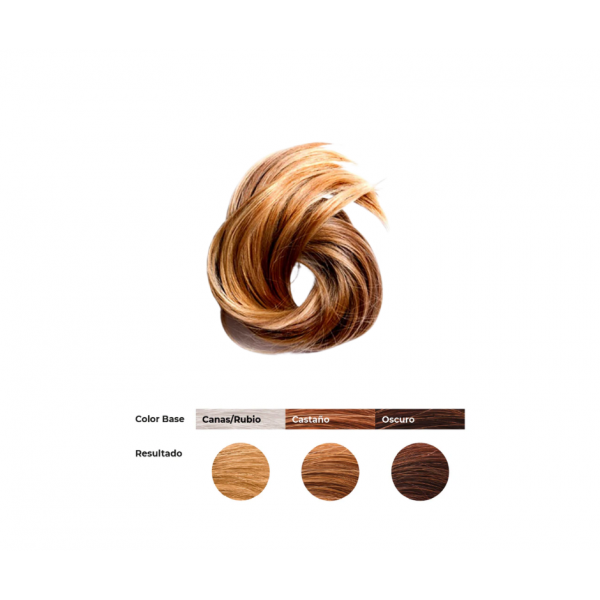 Este tono ofrece un color natural con reflejos dorados al cabello. En cabellos blancos o rubios aporta un castaño con reflejos dorados, ligeramente cobrizos, mientras que en bases castañas, al no aclarar, proporciona reflejos dorados cobrizos que iluminan la melena con naturalidad. Además, cubre la cana y aporta luz al cabello, que aplicación tras aplicación se vuelve más sano y bonito.